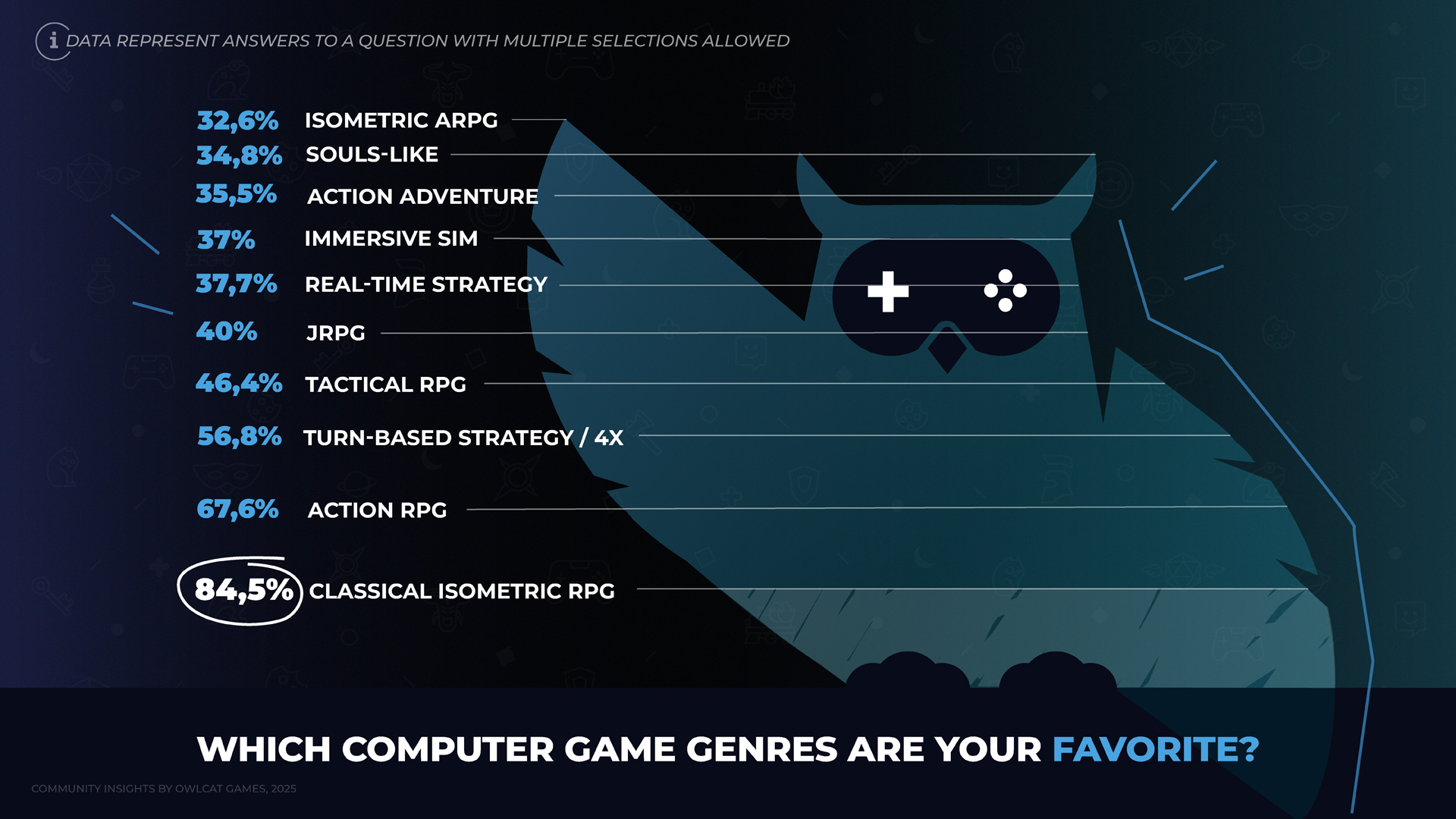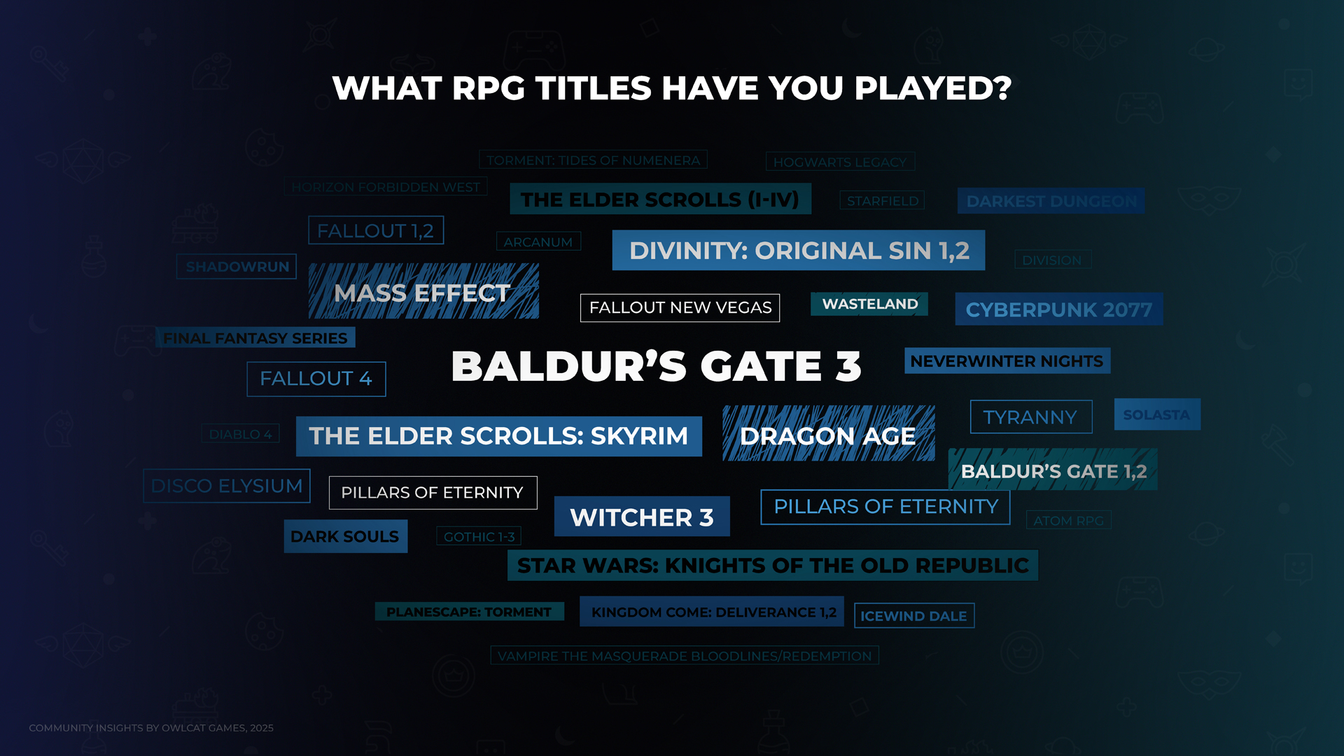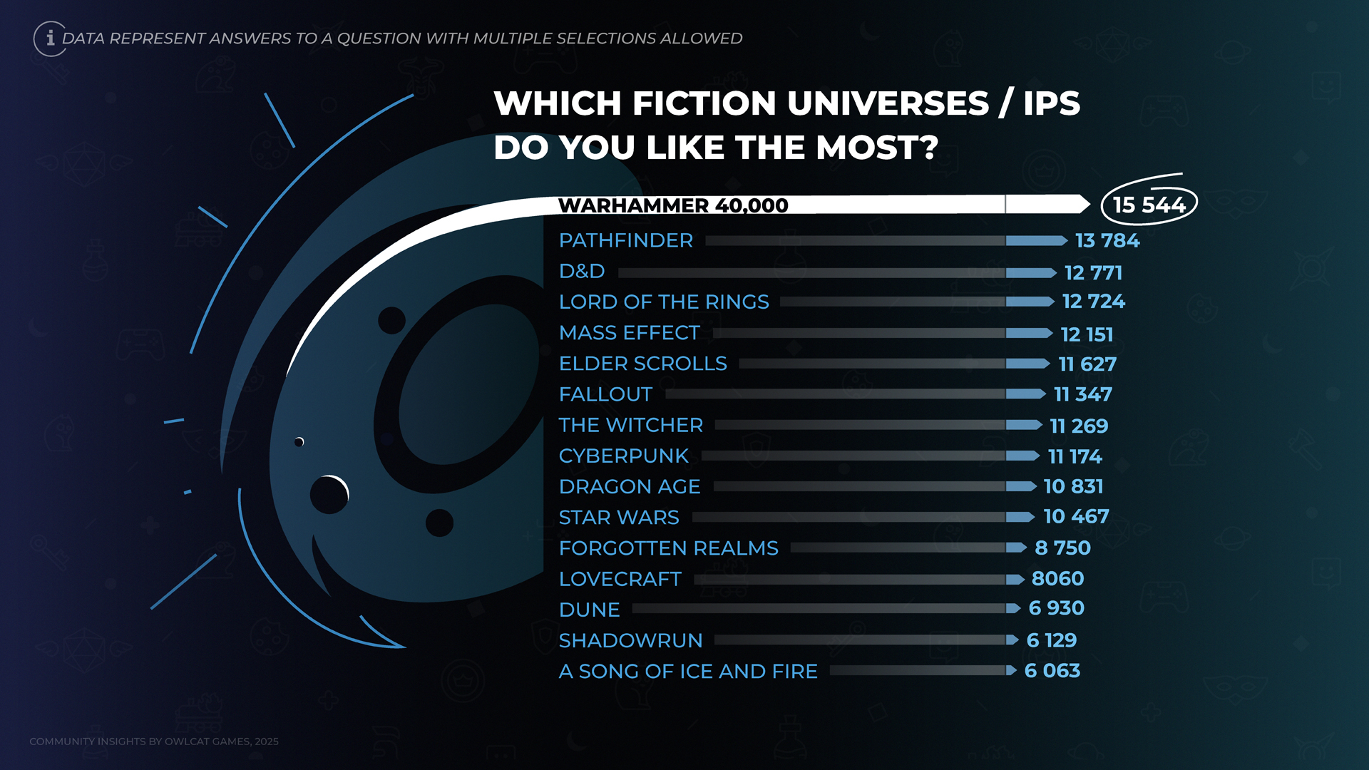 Obviamente, dista mucho de ser una lista completa de los juegos de culto y las propiedades intelectuales que habéis mencionado en vuestras encuestas. Hemos excluido intencionadamente los juegos de Owlcat, pero nos alegra que nos coloquéis a la altura de estos otros proyectos. ¡Tenéis un gusto exquisito!