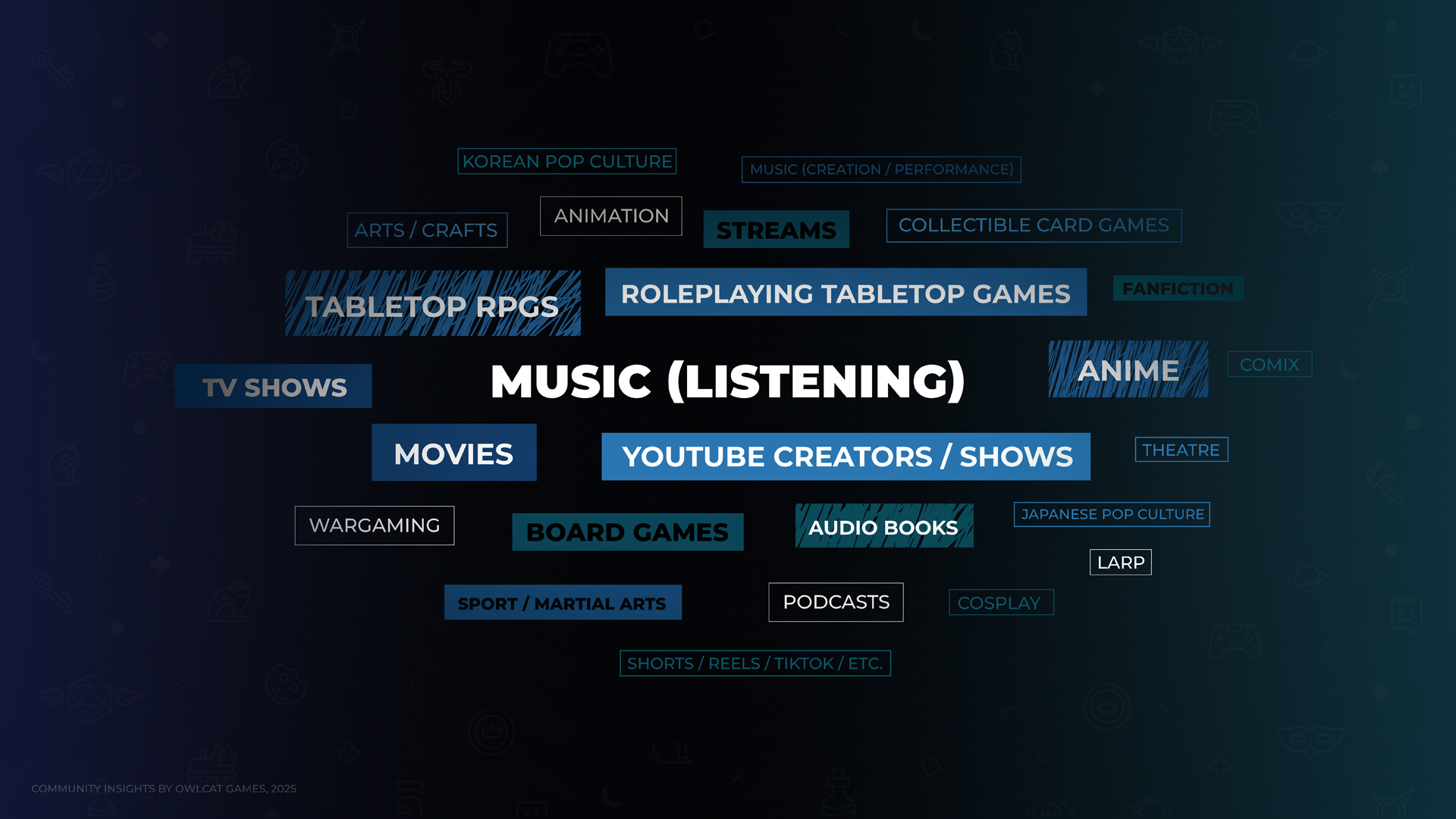 Algunos sois grandes aficionados de Warhammer y otros no podéis vivir sin música. Tenéis intereses muy diversos, aunque siempre hay sitio para gatos y memes, ¿no? Un 12 % de vosotros estaría de acuerdo, y con tantas respuestas eso es mucha gente.