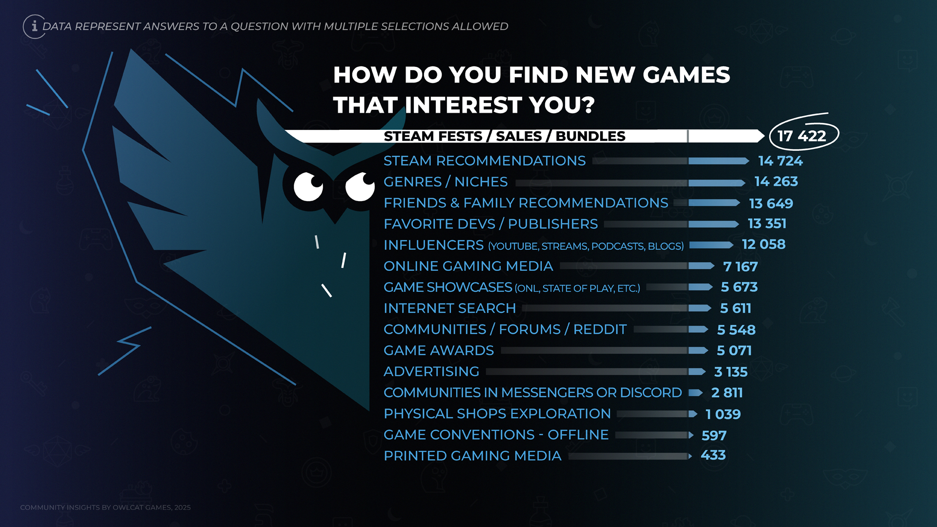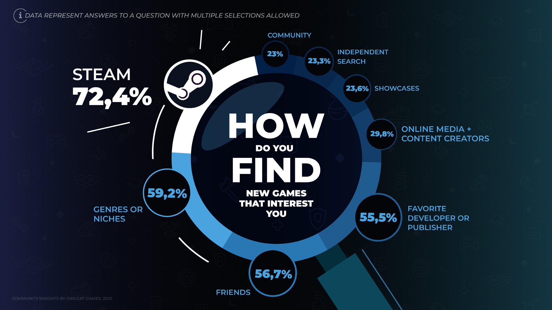 Por último, un tercio de nuestros jugadores prefiere explorar por cuenta propia, recorriendo los catálogos de Steam e itch, filtrando etiquetas, consultando colecciones e investigando.