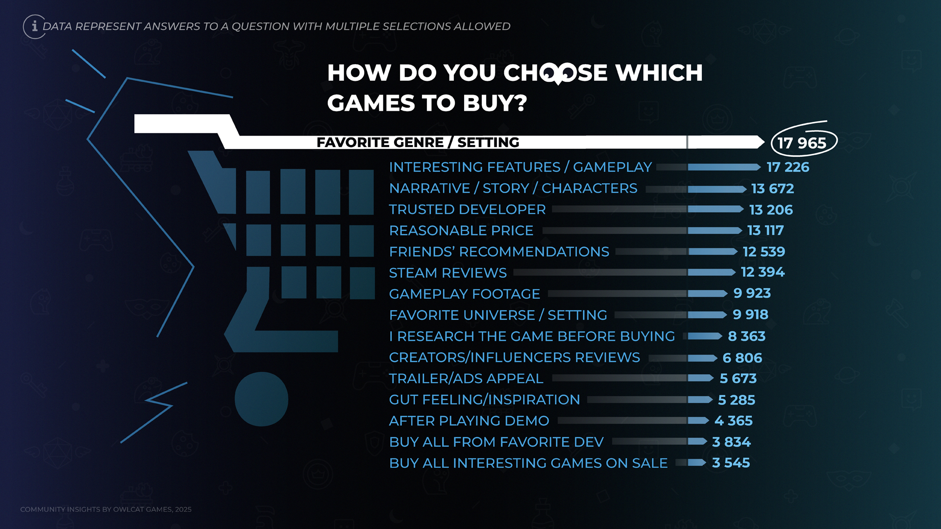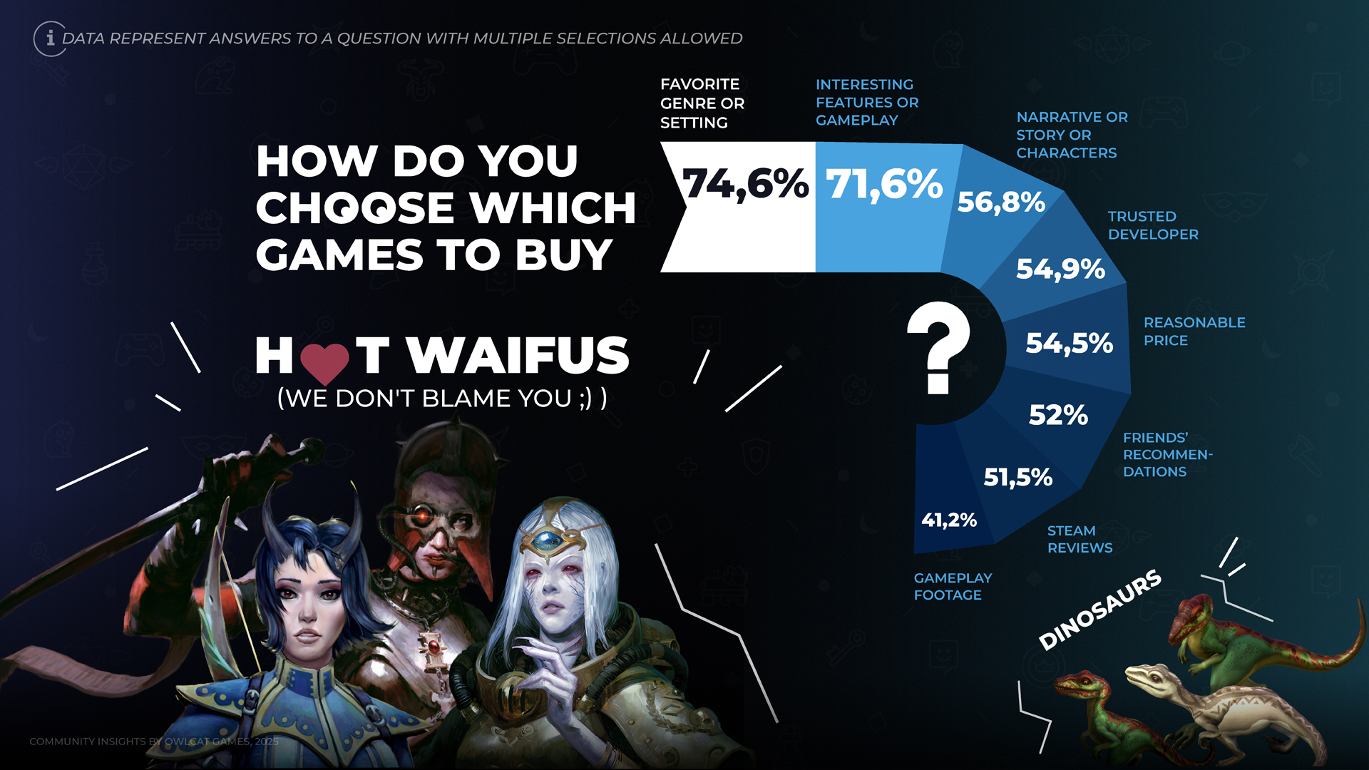 El año pasado, muchos mencionasteis la lealtad a los desarrolladores. Por eso este año lo hemos enfatizado y ha sido un acierto. Más de la mitad de los encuestados han mencionado la confianza en el estudio o la editorial como uno de los factores clave a la hora de comprar algo. Aunque el porcentaje de la categoría puede parecer modesto, hay que recordar que los encuestados podían elegir varias respuestas, y que más de 13 000 han mencionado la confianza en la editorial. Si una desarrolladora ya ha demostrado su valía, los jugadores están más dispuestos a apoyarla una y otra vez, independientemente del género y el tamaño del proyecto.