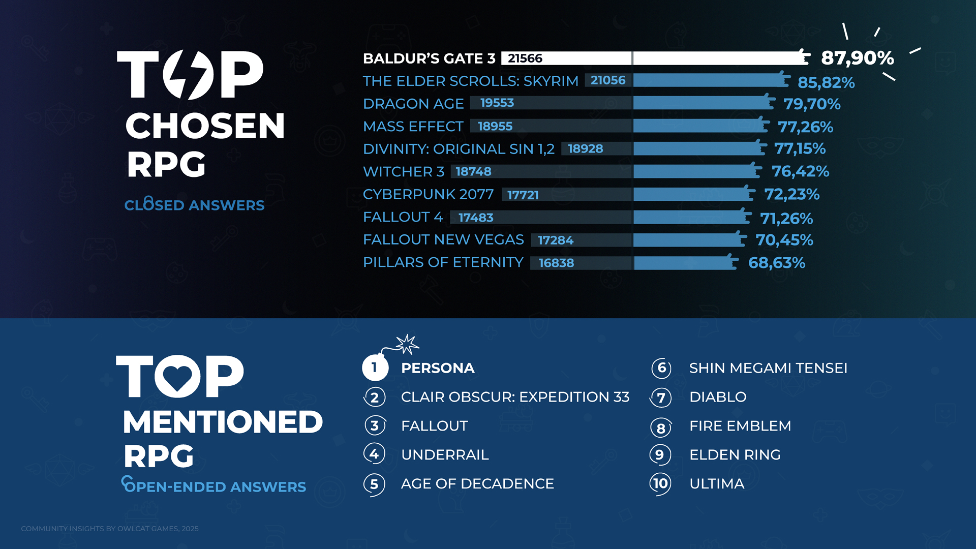Los juegos de rol encabezaron la encuesta con mucha diferencia. ¿Coincidencia? ¡No lo creemos! Estos son los géneros más populares entre los miembros de la comunidad:
