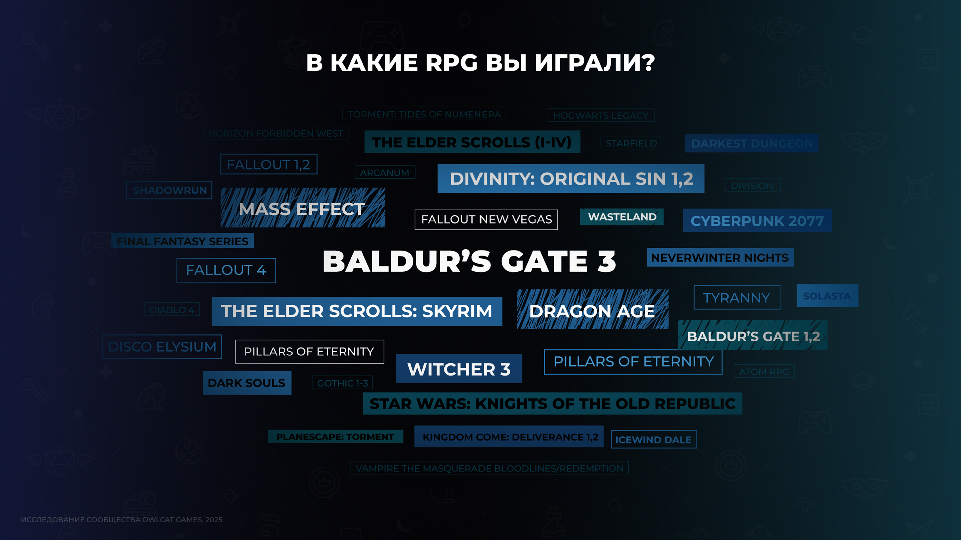 Конечно, это далеко не полный список культовых тайтлов и IP, о которых говорили респонденты. Игры Owlcat сюда специально не включали — но мы рады стоять в одном ряду с такими выдающимися проектами.