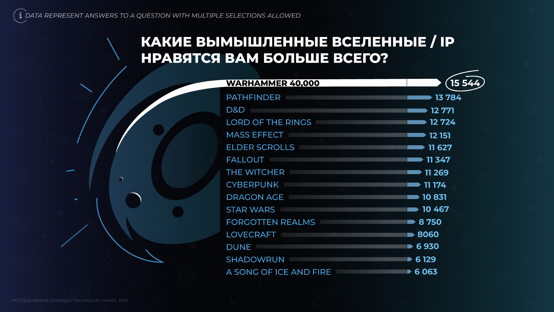Из года в год мы также спрашиваем о любимых вселенных. Для нас это возможность узнать, какие миры вас вдохновляют и что в них вызывает сильные эмоции. Обращаем внимание, что в данном вопросе аудитория могла выбрать несколько ответов. Вот, как голоса распределились в этот раз:
