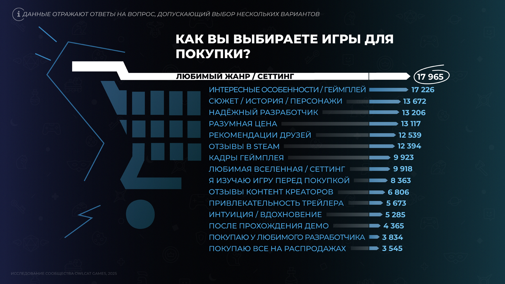 В прошлом году тема лояльности к разработчику звучала особенно часто. Поэтому в этот раз мы выделили ее — и не ошиблись. Более половины респондентов отметили, что один из ключевых факторов при покупке — доверие к студии или паблишеру. Даже, если в текущей инфографике процент данной категории выглядит скромно, стоит помнить: опрошенные могли выбрать несколько вариантов ответа, и доверие к издателю упомянули более 13000 человек. Если разработчик уже зарекомендовал себя, игроки готовы поддерживать его снова и снова, независимо от жанра и масштаба проекта.